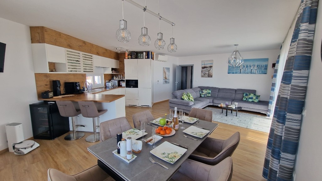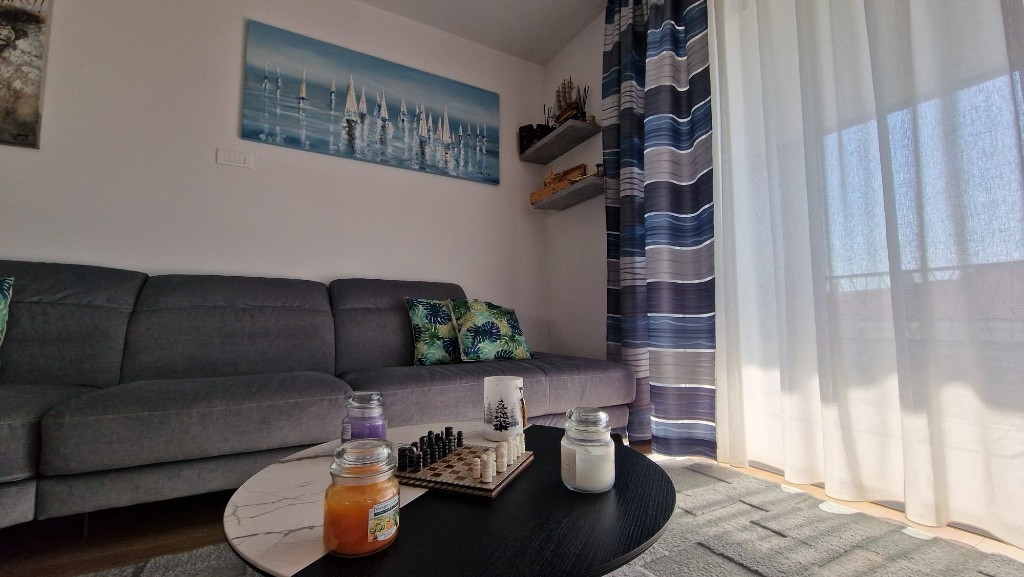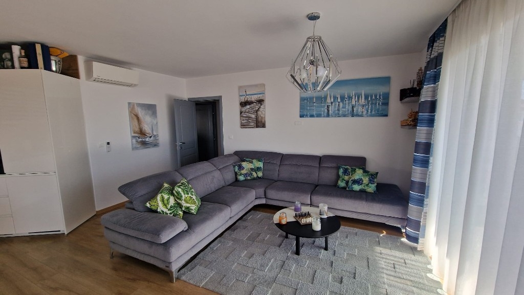 Zum Verkauf steht eine luxuriös ausgestattete und vollständig möblierte Drei-Zimmer-Wohnung in Baška Voda mit offenem Meerblick. Die Wohnung befindet sich im zweiten Stock eines neueren Gebäudes mit Aufzug und zeichnet sich durch einen sorgfältig geplanten Grundriss aus, der Komfort und Funktionalität bietet.